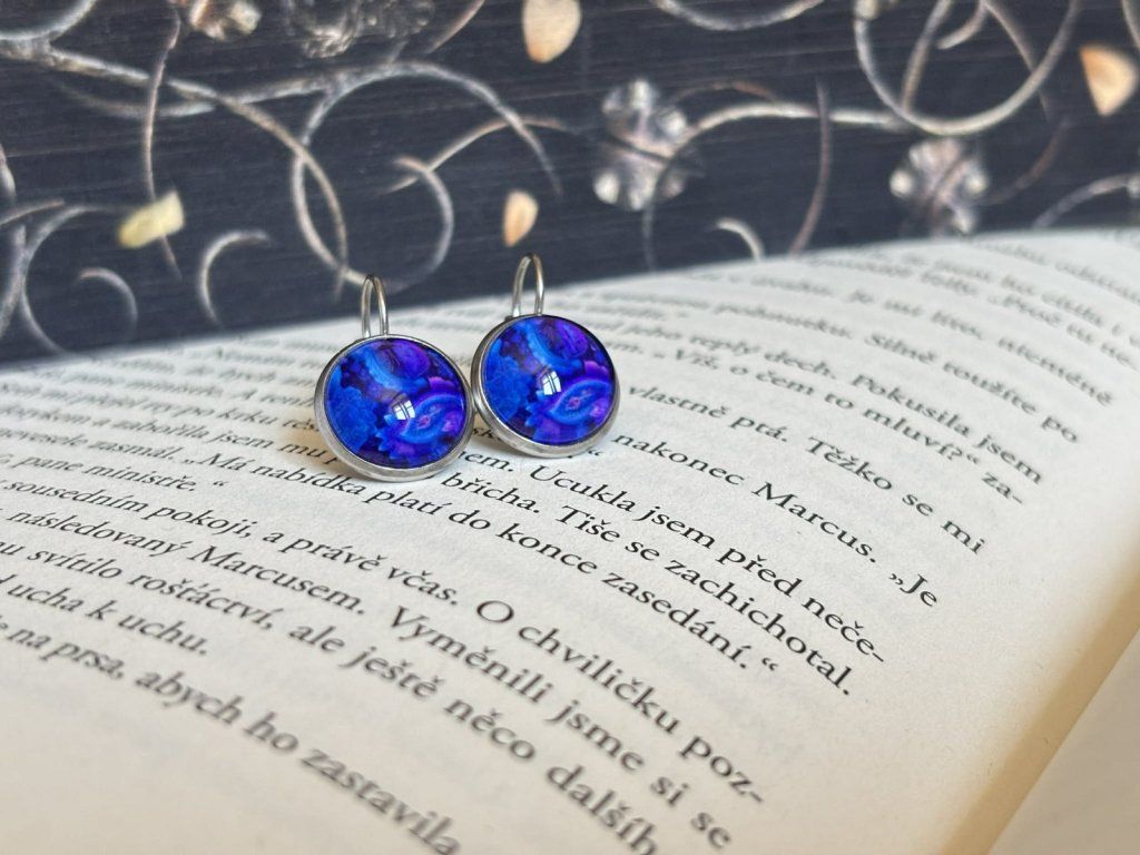 Náušnice s výrazným abstraktním motivem v odstínech modré a fialové.