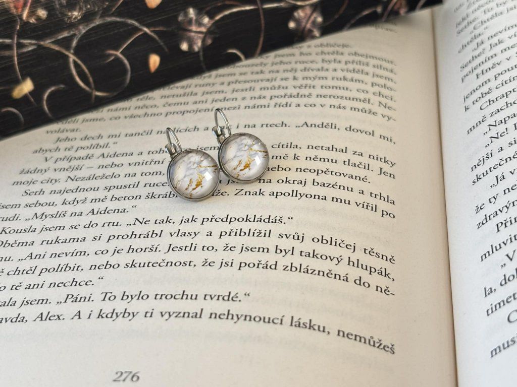 Minimalistické bílé náušnice s jemným zlatým žilkováním.